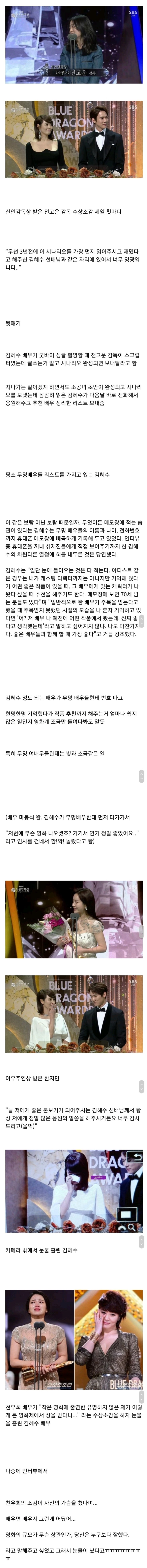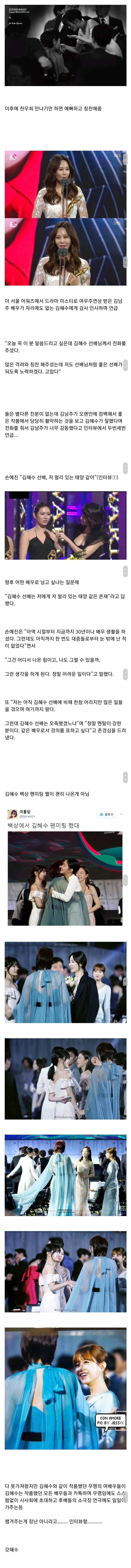 시콜연예계 양대 미담자판기 김혜수 유재석... 상을 밥 먹듯이 타는 게 아닌 이상 수상소감에서는 부모님 가족 스탭들 얘기하기도 시간적, 정신적으로 빠듯한데 그 와중에 콕 찝어서 언급하는 사람이 저렇게나 많다는 건 진짜 갓혜수 ㅠㅠㅠㅠ