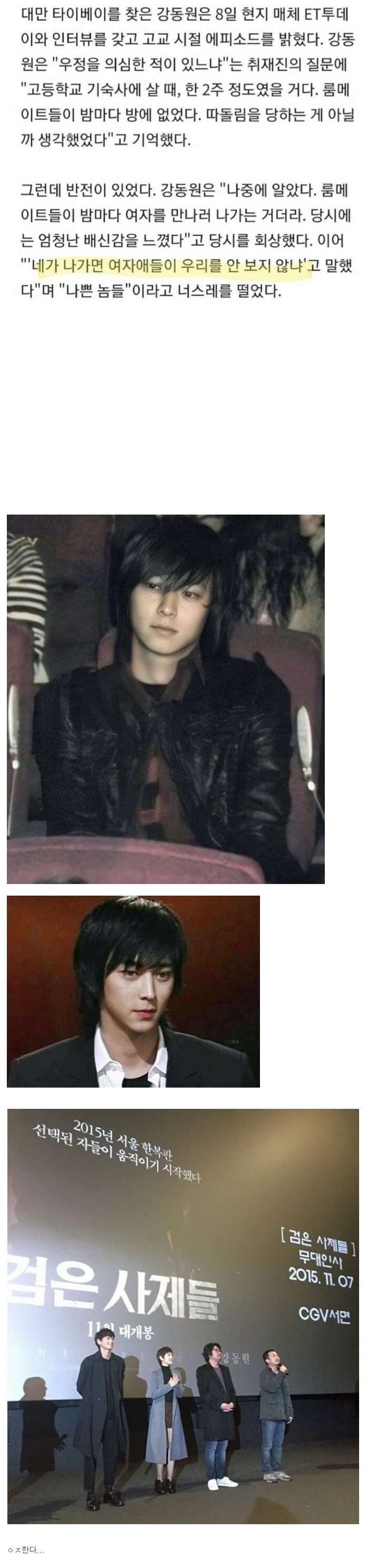 졸린 눈이 머쪄검은 사제들 시사회 후 강동원 : 여성 분들이 사제복을 그렇게 좋어하시는 줄 몰랐어요 제가 사제복 입고 나가니까 너무들 좋아하시더라구요........ 그래 이샛기야 너 옷빨이다 ㅠㅠ