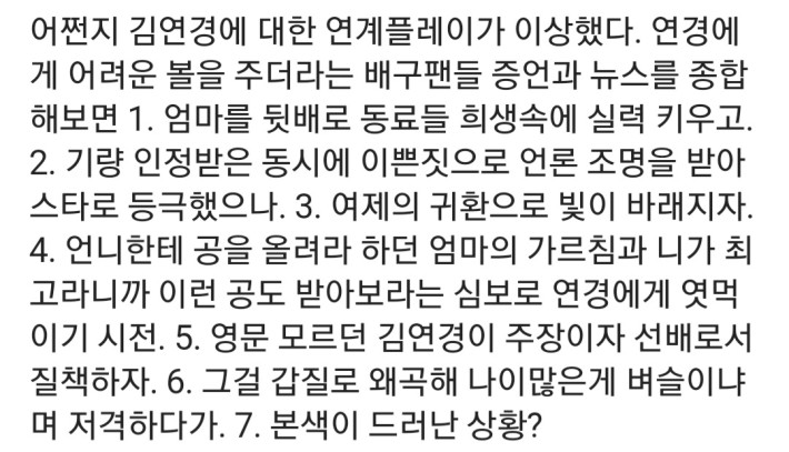 뮤르미돈김연경이 고딩시절 운동할때, 후배가 선배의 운동복은 물론 생리혈이 묻은 속옷까지 빨아주는 오랜 악습이 있었다고 함~ 그 어린 나이에 오랜 관행을 깨부술 정도의 성격인데 부조리한 걸 그냥 두고 볼리가... 빵빵한 엄마와 이모를 믿고 선배들에게 안하무인하고 뻘글로 sns질하며 방종하는걸 박미희 감독이 제제를 했어야했음~ 팀내 기강을 왜 김연경 선수가 잡아야 하나...?
