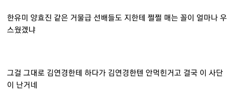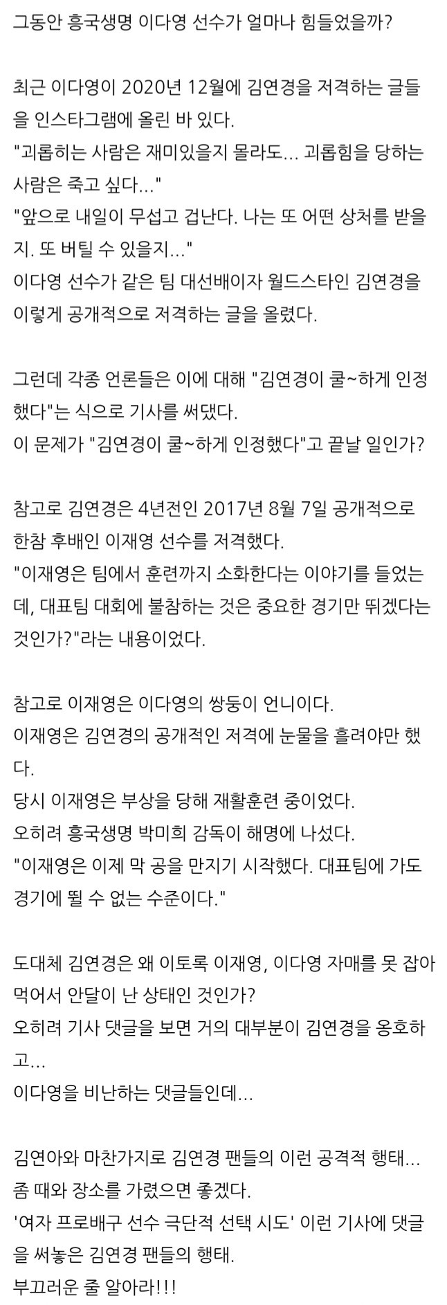 쩜핑예측되는 정황.. 1. 자매가 엄마빽에 여초 여왕벌 역할 맡으면서 구단 실세로 선배든 후배든 선수단 쥐락펴락하고 있었음. 2. 굴러들어온 돌 김연경이 여왕벌 기싸움에서 안져주고 선배 역할 하던대로 한듯. 김연경 입장에선 본인이 여배의 메날두나 다름없고 연봉삭감하고 왔는데 듣보잡들한테 져줄이유가 없음. 3. 엄마 빽으로 맨날 이겨먹어야하는 자매 입장에선 실력으로 비빌수도 없고 기싸움은 이겨야겠으니 sns언플해서 선배갑질로 몰아가고 극단적선택 등 show하기 시작. 4. sns언플이 수면위로 뜨자마자 학투 등장. 5. 게임셋ㅃㅇ