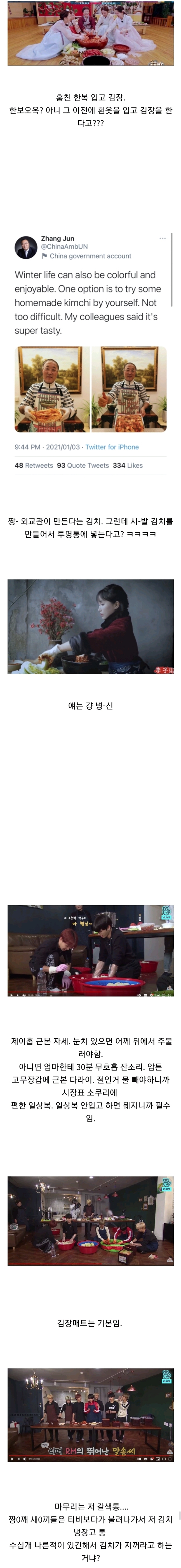 냐냔냐냐나 진짜 맨밥에 김치 얹어서 먹는거 정말 좋아해서 쭹궈들이 저러면 곤란해. 우린 유아때부터 김치 씻어 먹인다 임뫄. 김치워리어 있냐고 김치유산균제품 있냐고 그냥 늘 그렇듯이 매미튀겨먹고 오리대가리 삶아먹어라 확마 김치로 담가불라