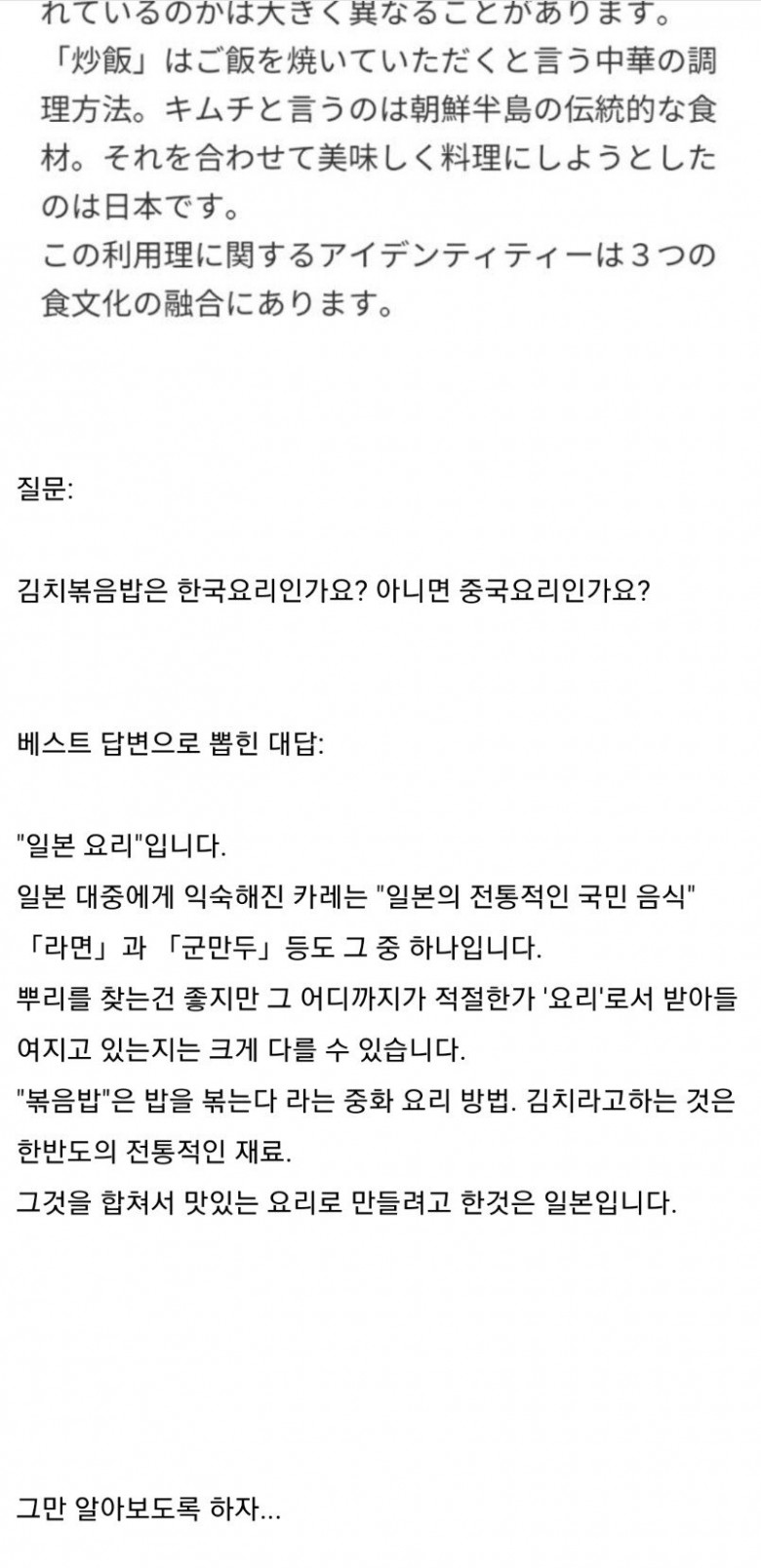 김치도 맵다고 못먹는 것들이 김치볶음밥을 지들꺼라고 우기는거 자체가 우스운 발상이다... 기무치도 김치 흉내내서 지들꺼라 우길 때부터 알아봤다