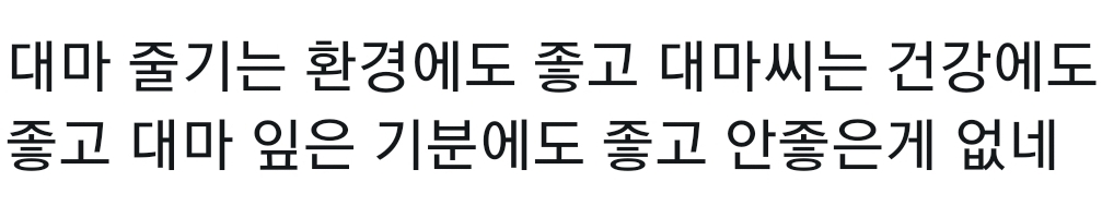 테익미홈담배는 암걸리는데 담배도 나쁜건데 피게 해줄거면 대마가 더 낳지 않냐? 대마 함량을 적게해서 만들면 괜찮지 않겠나?