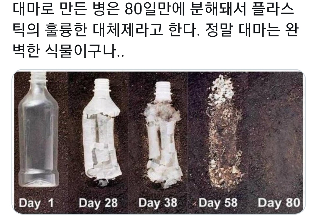 포포땅1회 용기정도로 바뀐다면 좋겠네요 하지만 여기서도 문제점이 있는데 80일이면 없어지니깐 강이나 바다 쓰레기 일부러 버릴거 같네요 막 버리다보면 사람 인식 문제가 버려도 나쁜일이라고 인지하지 못하게되고 어린이들도 배우게 됨 이걸 또 고치려면 아예 못버리게 해야되는데 또 문제점이 플라스틱이랑 대마랑 구분이 안됨 재ㅎ할용 섞임 또 교육도 해야되고 재질표기해야되고 결국 무산