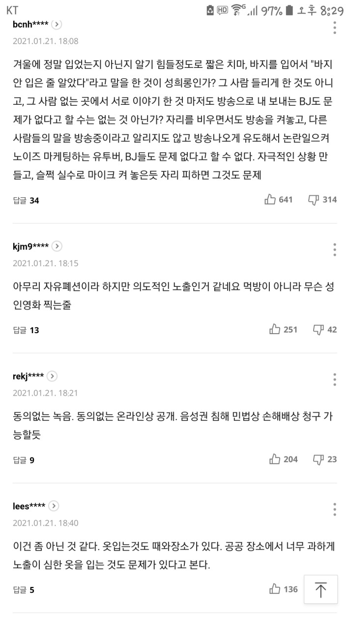 베댓전문킬러솔직히 저남자들 잘못은 했을지언정 도라이라고 생각은안한다. 나역시도 길가다 야한차림에 카메라들고 개인방송하고있는 별창들보면 뒷담화깔것같은데.나뿐만이겠어?