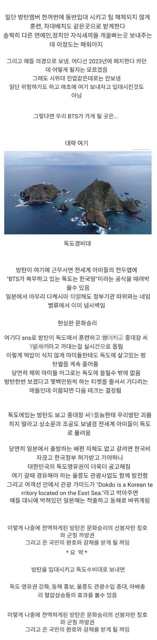 완전!!!국방부 보고있나 BTS 독도경비대로 근무하게 해줘라 일본 정부 피꺼솟하게