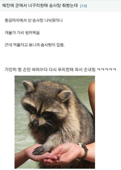 똘방이군대썰은 개뻥임 너구리는 라쿤처럼 손못씀...한국에 야생라쿤이 살지도 않고....;;