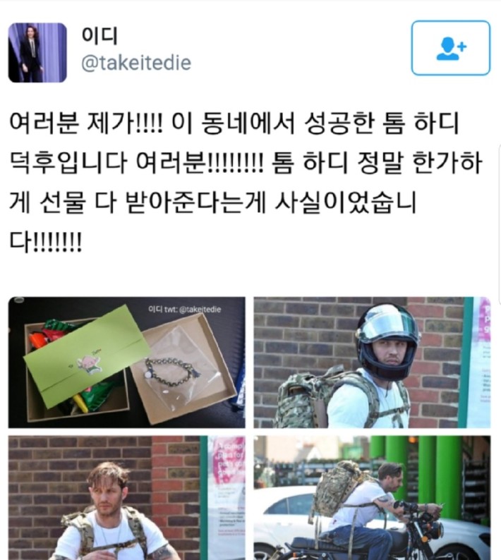 차돌숙주한국 팬이 보낸 위안부팔찌 착용해준 톰하디. 참고로 이 팬분이 위안부팔찌에 대한 썰 풀고 착용해주면 좋겠다고 했다 함.