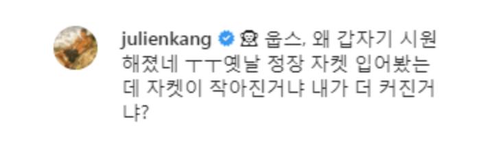 잘들지내요^^잘생겼어 키커 어깨넓어 비율좋아 근육빵빵 인성좋아 줄리엔강에게도 열등감이 있을까..??