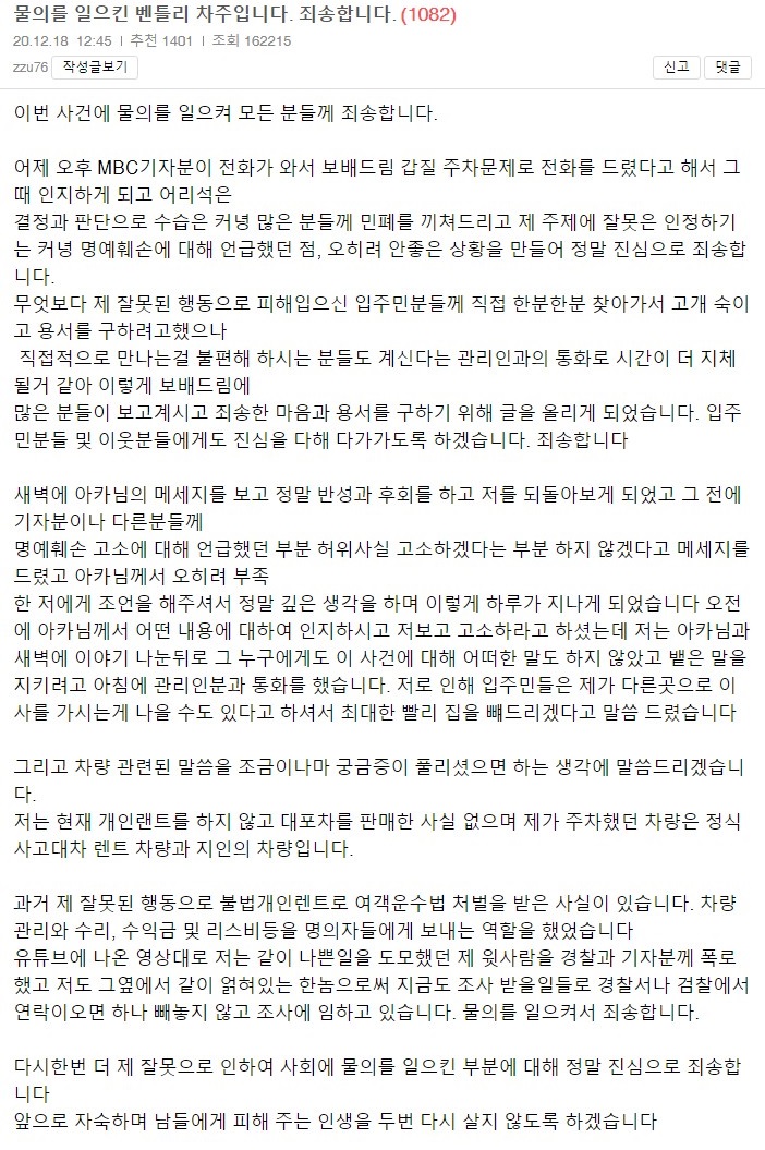 점점 주차 문제가 공론화가 되자 주차 갑질남은 쫄려서 그런지 사과문을 보배드림에도 올리고