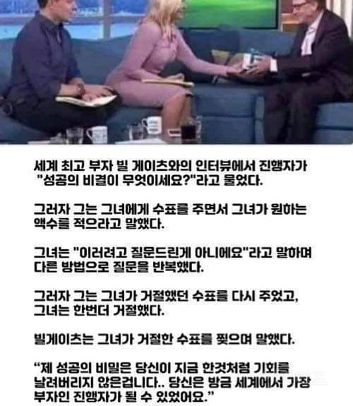 진행자: (수표를 받아 숫자를 마구마구 쓴다)빌게이츠: 자 이제 다시 줘보세요진행자: (수표를 건넨다) 빌게이츠: (수표를 찢으며 말한다) “제 성공의 비밀은 가진 기회를 내주지 않는 겁니다” 고수의 철벽방어