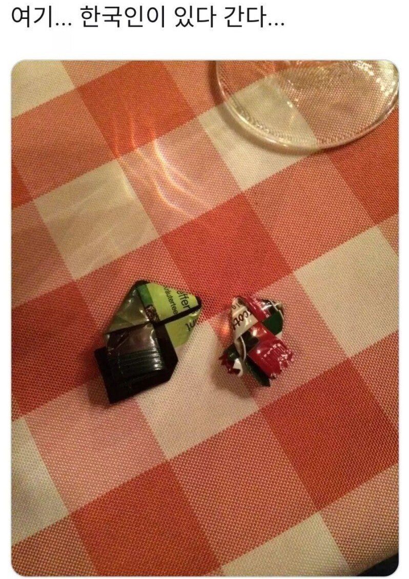 방방이이냅킨 갈기갈기 찢어놓고 접시에 남은 음식으로 표정을 만듦 = 한국인