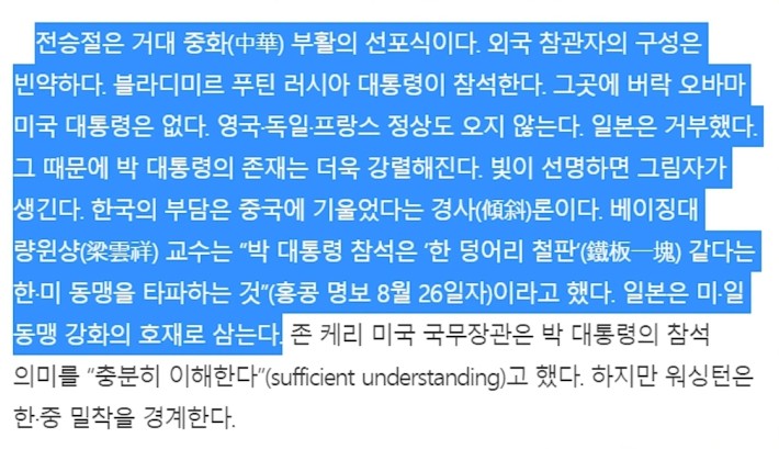 네이뿜이다@생각좀하고 살아라 조중동의 한면에 나온 내용이다. 네녀석 지능이 낮아 똥과 된장을 구별 못하는것이지 ㅋㅋㅋ중국몽 빨아제기려 하다보니 기사가 모순된 내용인데, 영국 독일 프랑스 정상이 왜 참석 안했을까? 일본이 왜 거부했을까? 우리 박통의 존재가 왜 강렬할까??? 공산당 선포식에 민주주의 대표가 나홀로 참석하며 조공관계를 허락하니 엄청 강렬한 모습 맞지 ㅋㅋㅋㅋㅋㅋㅋㅋ 워싱턴은 왜 경계했을까? ㅋㅋㅋ