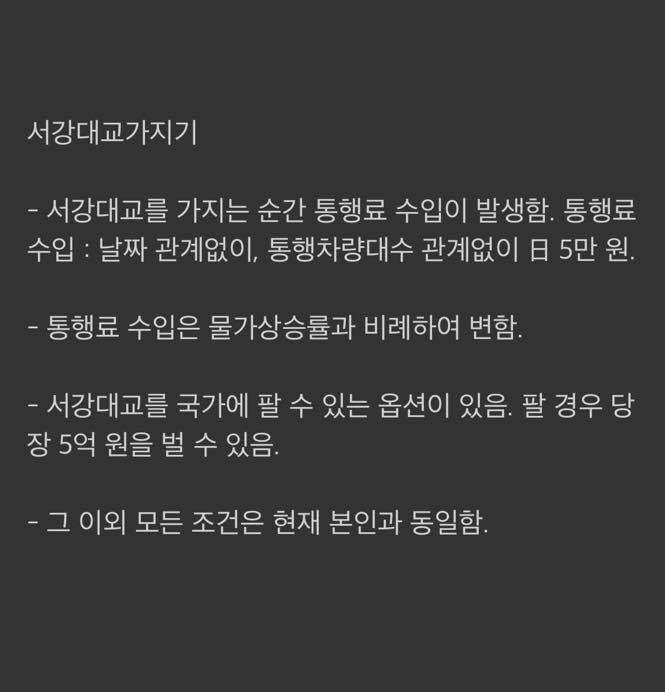 행복하냐??서강대교가 내것이 되는게 돈벌기 제일 좋겠네.. 다리 지나가는 차량에게 5백원씩만 받아도 얼마야..