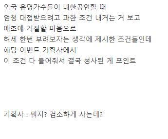 Asd1235본인은 과한 요구라고 생각하고 저렇게 말한거 같은데 생각해 보면 해외 트아압 스타들 저것보다 더 대우받고 공연하지 않음?옛날인거 감안해도 검소한거 맞는듯?ㅋㅋ