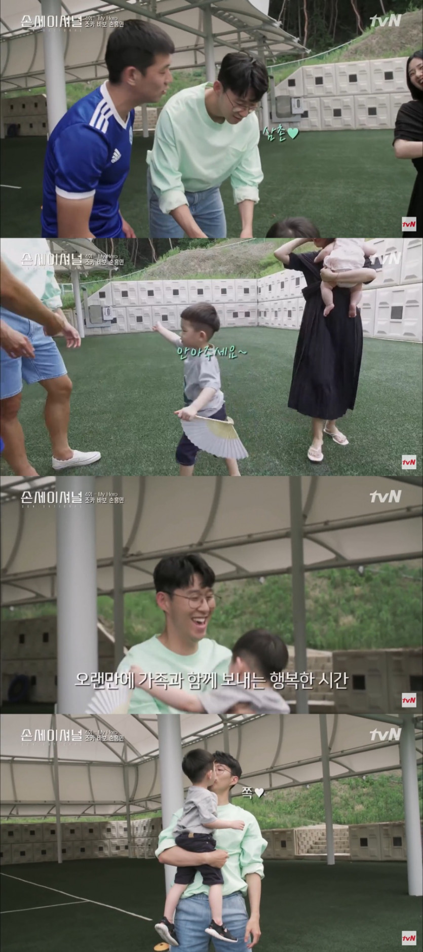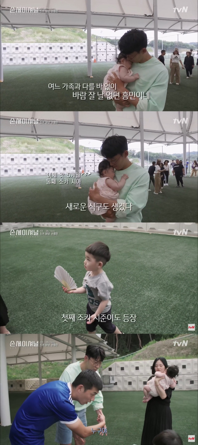 건강해라!손흥민이 무릎에 손집고 몸을 숙이고 있는 와중에도 따로 돌아다니는 조카의 모습이 인상적이네요.
