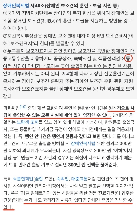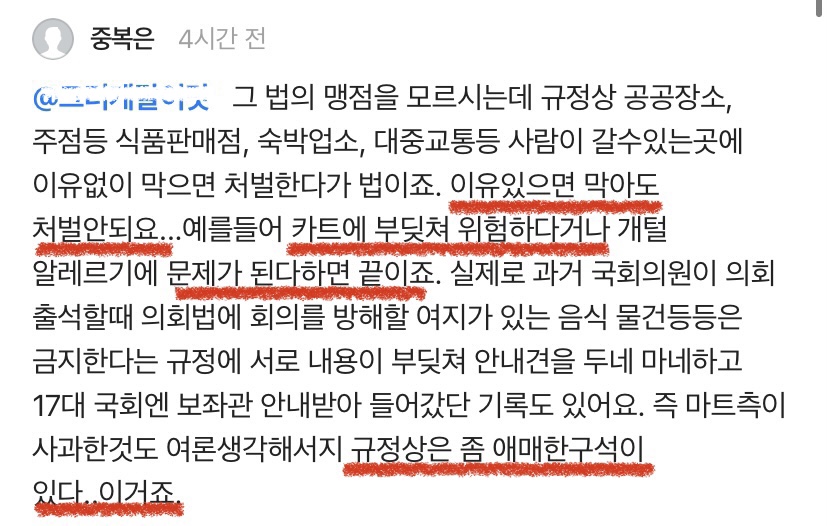 내행운을빌어줘@이해하는데3분 어쨌든 안내견 출입 및 봉사자와 그 훈련견까지 마트 출입이 가능하다는 법을 숙지 못 한 마트측에 책임이 있구요. 이 법을 악용할 수 있는 사람이 있다는 것에 대해 일단 과태료 부과가 된다는 법이 있지만 추가로 더 꼼꼼하게 개정안이 있어야 한다는 님의 말도 알겠구요. 그렇다고 해서 내가 오늘 마트에 갈거니까 알아두라고 전화 해야 한다는 님의 의견은 정말. 정말. 이해는 안돼네요.