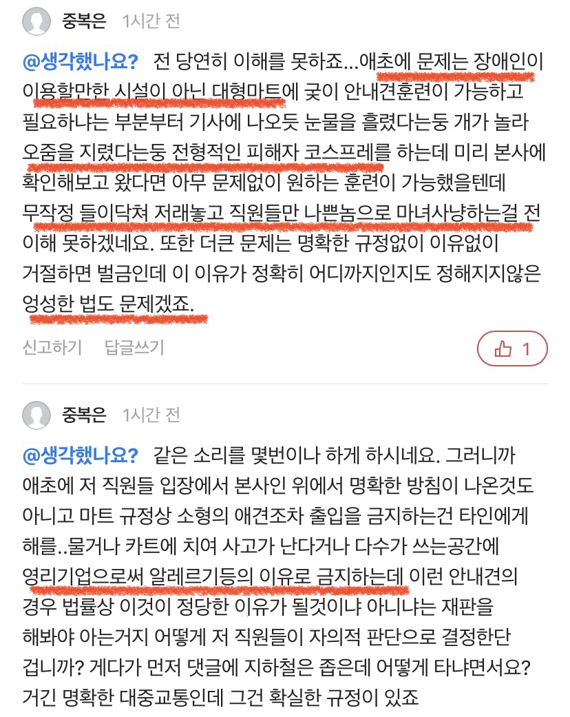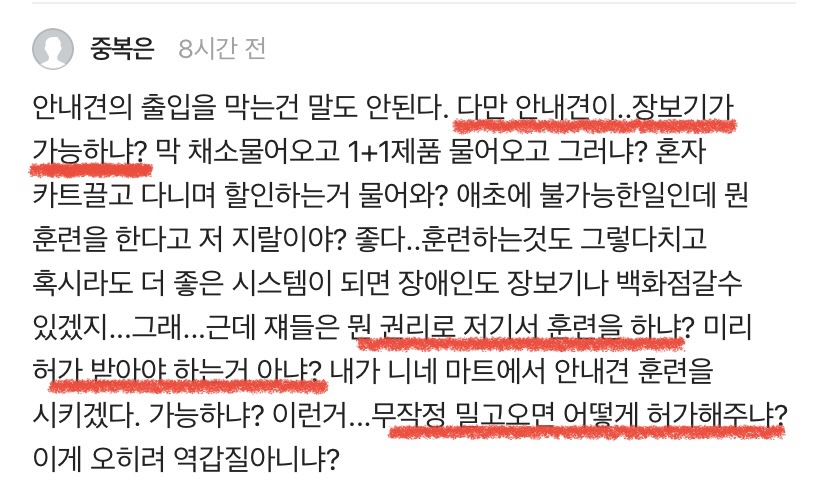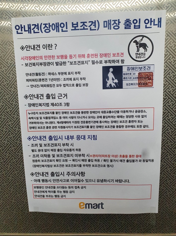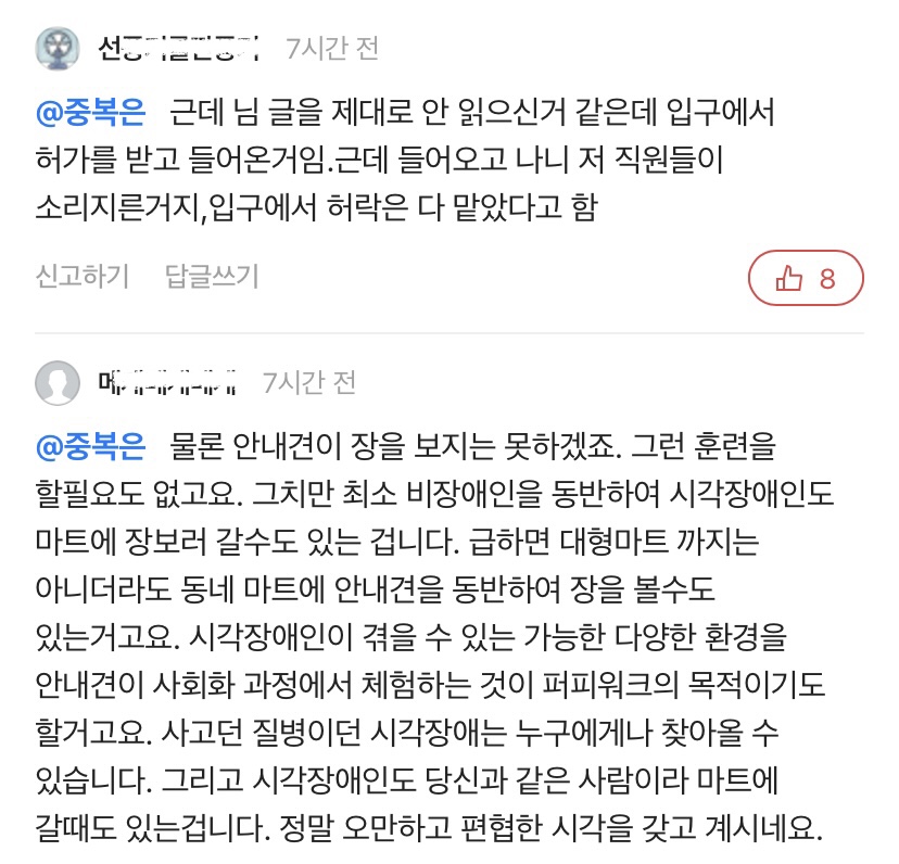 Qwaszxqwas이건 마트의 문제가아니지 제도의 문제잖어 누가봐도 호불호가 갈리는 마트에 개 대리고 들어오기인데 여기에 사회적 약자인 안내견이니 감수해라가아니라 마트나 백화점같은 메이져면 장애우편의를위해 안내견보관장소에 개너두고 안내 직원이 붙어서 쇼핑을 도와줄수있도록 하는게 맞지않음?