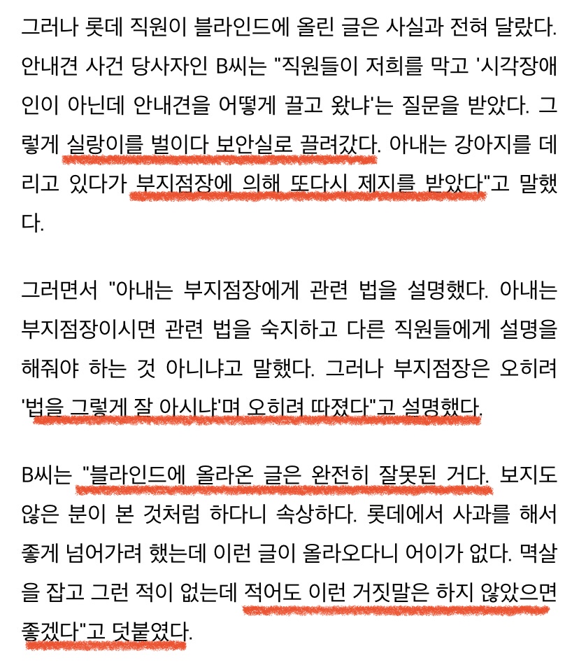 이해하는데3분@내행운을빌어줘 딱히 롯데가 응대에 문제가 있었다고 시인한 시점에서 롯데마트의 행위를 변호할 생각은 없습니다. 사전에 직원을 충분히 교육시키지 못하고, 바람직하지못한 롯데의 응대에 변명의 여지는 없으며, 현행법에 불만이 있다 해도, 법은 존중되어야하기 때문에 롯데는 처벌을 면하지 못할것이며, 저를 포함한 많은 사람들이 장애인복지법 40조의 내용을 정확히 모르고 있던 상황에서, 이번 일은 그 내용을 널리 알리는 계기가 되었을 뿐입니다. 다만 앞서 말한 우려와, 롯데 입장에선 억울할 수 있는 부분도 있다는걸 이야기하고 싶엇습니다