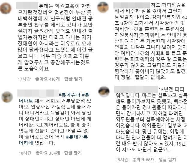 푸린족안내견에 대한 인식이 없어서 발생한 결과라고 생각함.. 롯데마트가 아니었어도 충분히 발생 가능한 일임 퍼피워커 였다는분의 말만 봐도 지하철 타려면 역무원부터 설득해야 하고 마트에 들어가려면 마트입구에도 못들어갔다는더 봐요 여러분.. 롯데마트측에소 안내견에 대한 방침이나 직원교육이 없었던 것도 마트에 안내견 돌아다니는거 봤습니까? 지금 현재 안내견이 마트에 돌아다니지 않고 맹인들이 쇼핑하지 못하는 현실 이니까... 법에는 안내견이 마트나 음식점 등 어디든지 출입할 수 있다고 명시되어 있긴 하지만 그에비해 사람들의 인식이 많이 부족함