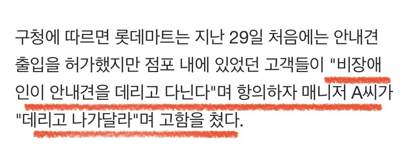 내행운을빌어줘@이해하는데3분 이 사건은 입구에서는 입장이 가능하다고 안내받아서 마트에 들어왔는데 중간에 다짜고짜 소리지르며 화를 냈다고 합니다.ㅡ첫번째, 마트에서 법적으로 명시되어 있는 안내 훈련견의 입장이 가능하다는것을 숙지 하지 못 했다. ㅡ두번째. 어쨌든 입장을 했다면 마트책임자는 어떻게 입장이 가능했는지 확인했어야 했다. 그리고 왜 입장이 가능한지도 확인 했어야했다 ㅡ세번째, 적어도 서비스업에 있는 사람이라면 고객들이 매장에 있는데 소리는 지르지 않았어야 했다.