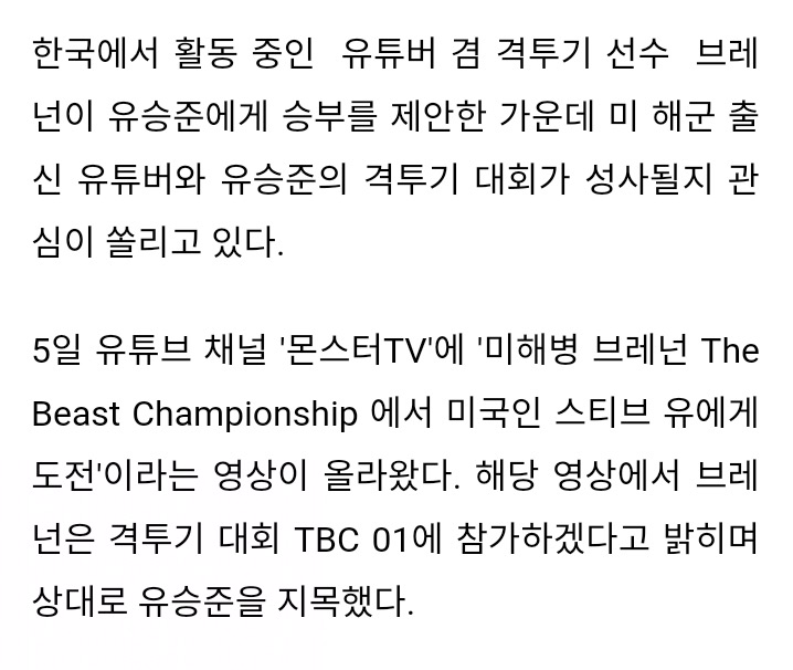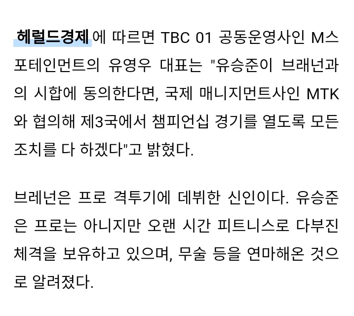 부동액브레넌 아프간 파병까지 다녀온 분인데.. ㅋㅋㅋㅋㅋ 격투기 커리어 위해 한국에서 태권도도 연마하셨고요 ㅋㅋ 일방적 경기 예상되네요.