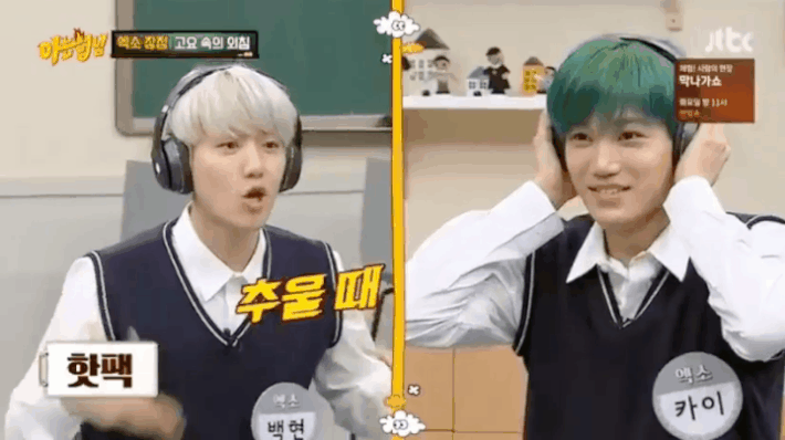 외부소음 차단하는 헤드셋 끼고 상대방이 단어 설명해주는 걸 입모양으로 알아들어야 하는 게임인데 백현(왼)의 말을 잘못 이해한 카이(오)ㅋㅋㅋㅋㅋㅋㅋ