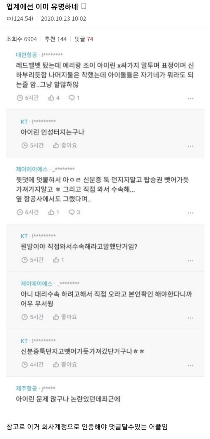 우리개사일이여자에 제일 무서운 적은? 당연히 같은여자 ㅋㅋㅋ 저기 대한항공 존나웃겨ㅋㅋ아이린만 그랬겠냐? 일반인중에도 더한개싸가지 존나많잖아? 그럼 아이린이 지한테 굽신거리면서 티켓받아가야하냐? 지금 아이린인성 어쩌고 하는애들 다 여자들아님? 설리때조 구하라때도 다 같은 여자년들이 이랬데 저랬데 한거아냐? 댓글 단것들중에 진짜 아이린이랑 얘기해보거나 격어본년있냐? 스텝들이 어쩌고 저쩌고 했으니 진짜다? 연예인그꼴보기 싫으면 때려쳐야지...연예인이 스텝한테 설설 기어야하냐? 연예인이 다 유재석같은줄아냐? 존나웃겨 ㅋㅋ역시 냄비근성 ㅋ