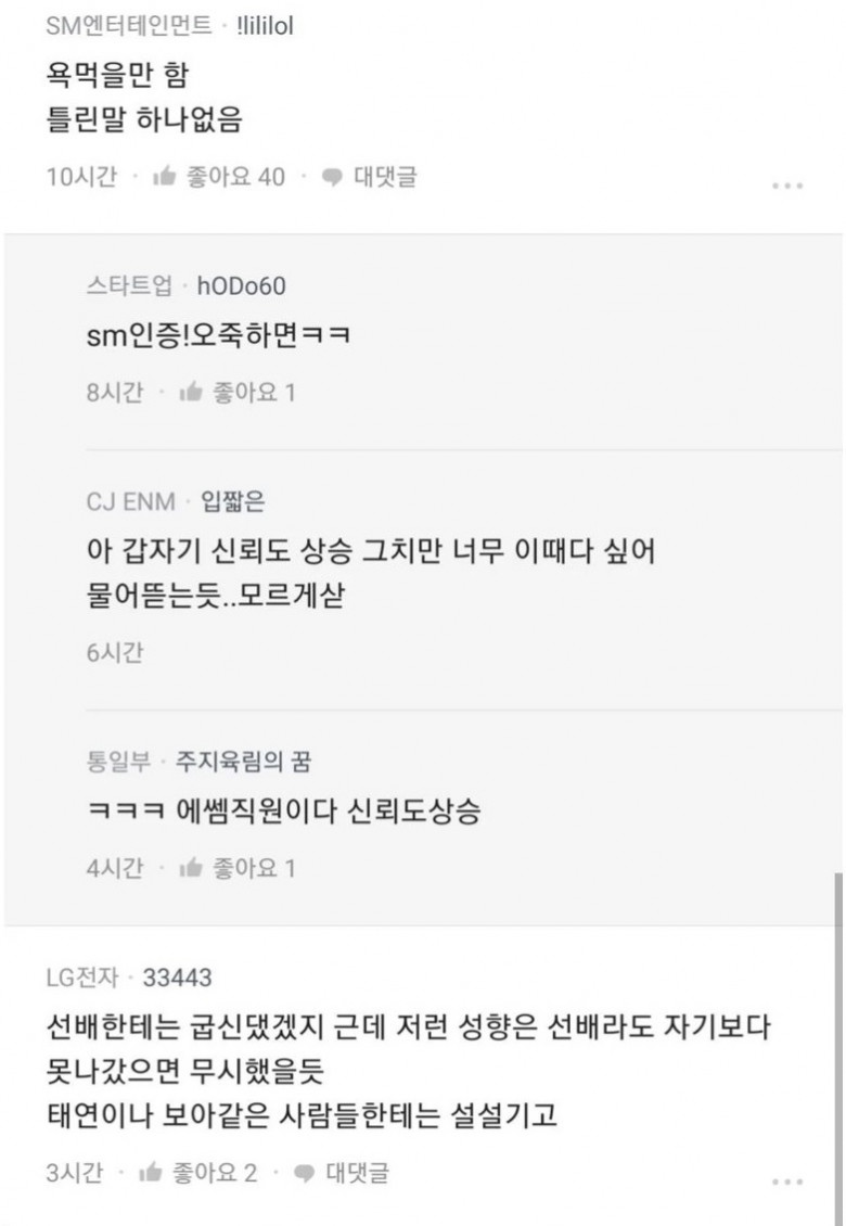 뿜10년차 과장한국 종특 나오네. 회사 직원이면 sm모든 사람이랑 다 상대함? 확실한 증거 나올때까진 중립 박아라. 양예원 사건때도 피해자의 눈물이 증거니 뭐니 하더니 ㅉ