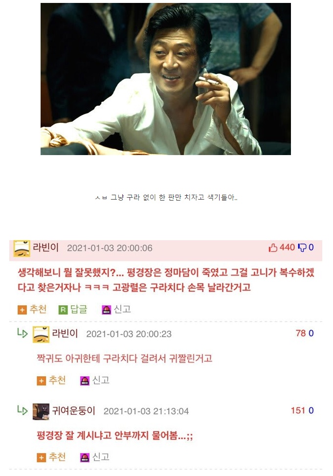 우키키키킥킥애들이 영화 제대로 안봤네. "오늘밤 고니는 무조건 내 손에 죽는다. 문제는 돈인데, 정마담 그년이 여우니께 조심해" 라며 살인선언하고 들어온 놈인데 무슨ㅋㅋ 고니랑 칠때도 계속 한끗차이로 이긴거보면 구라쳤을꺼도 뻔하고. 정작 사쿠라뜨니까 다짜고자 고니 손모가지찍으라질않나. 악역은 악역이지 물론 지딴엔 곽철용 복수(라고는 안하고 고깃값을 번다고 했지만) 한다고 나온거지만.