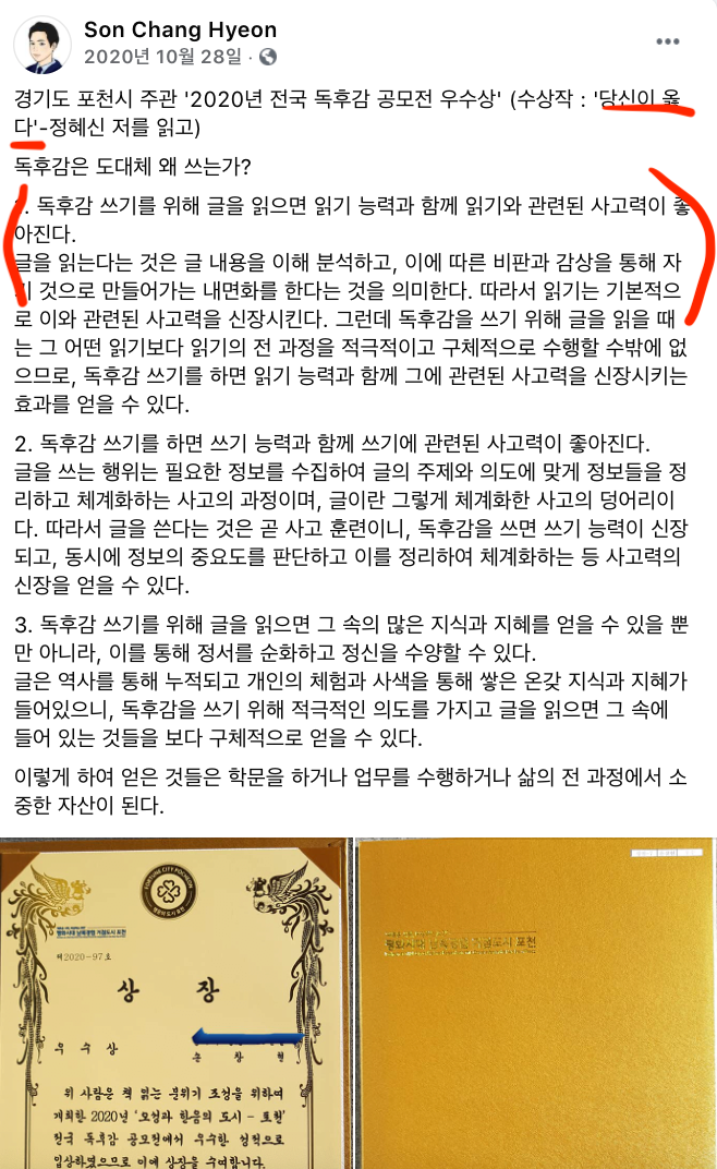 17. 그냥 페이스북 피드에 올리는 글 마저 표절함 --> 단순히 공모전에서 상금 받아먹으려는게 아니고 정신병이 확실함