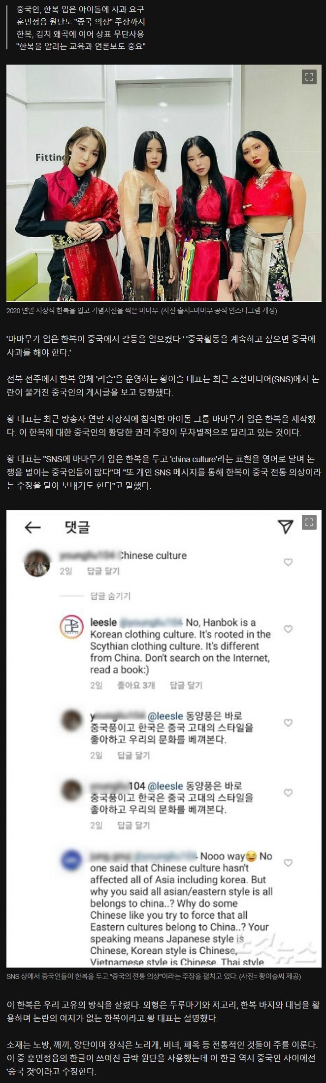 한복이 중국 문화라고 우겨대는 중국 네티즌에게