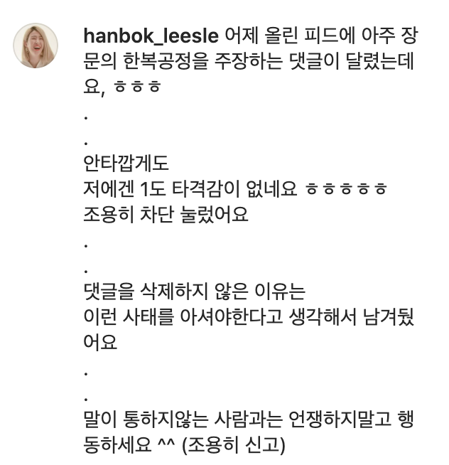 리슬이가 만든 것을 과연 한복이라 칭할 만 한가??한복은 중국것이 아닌 한국것임 .하지만 리슬이란 사람이 만든것은 소재와 기법만 한복을 따라했을뿐 색감이나 느낌은 중꿔 맞는데 무조건 중궈싫다고 쉴드쳐줄 문제가 아니라