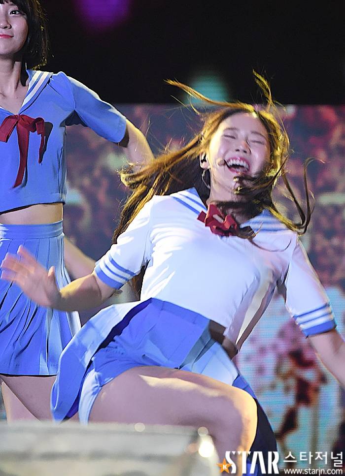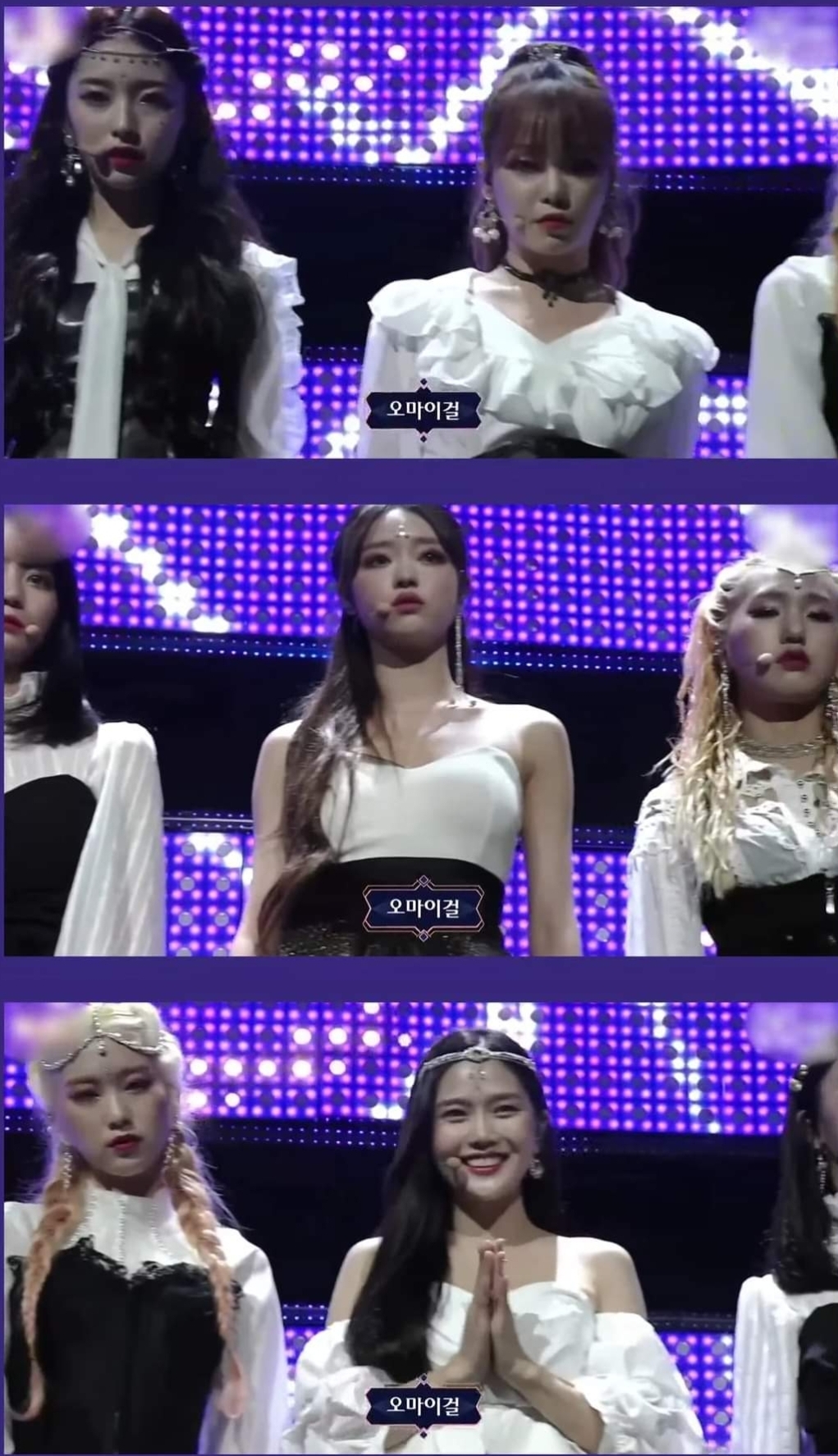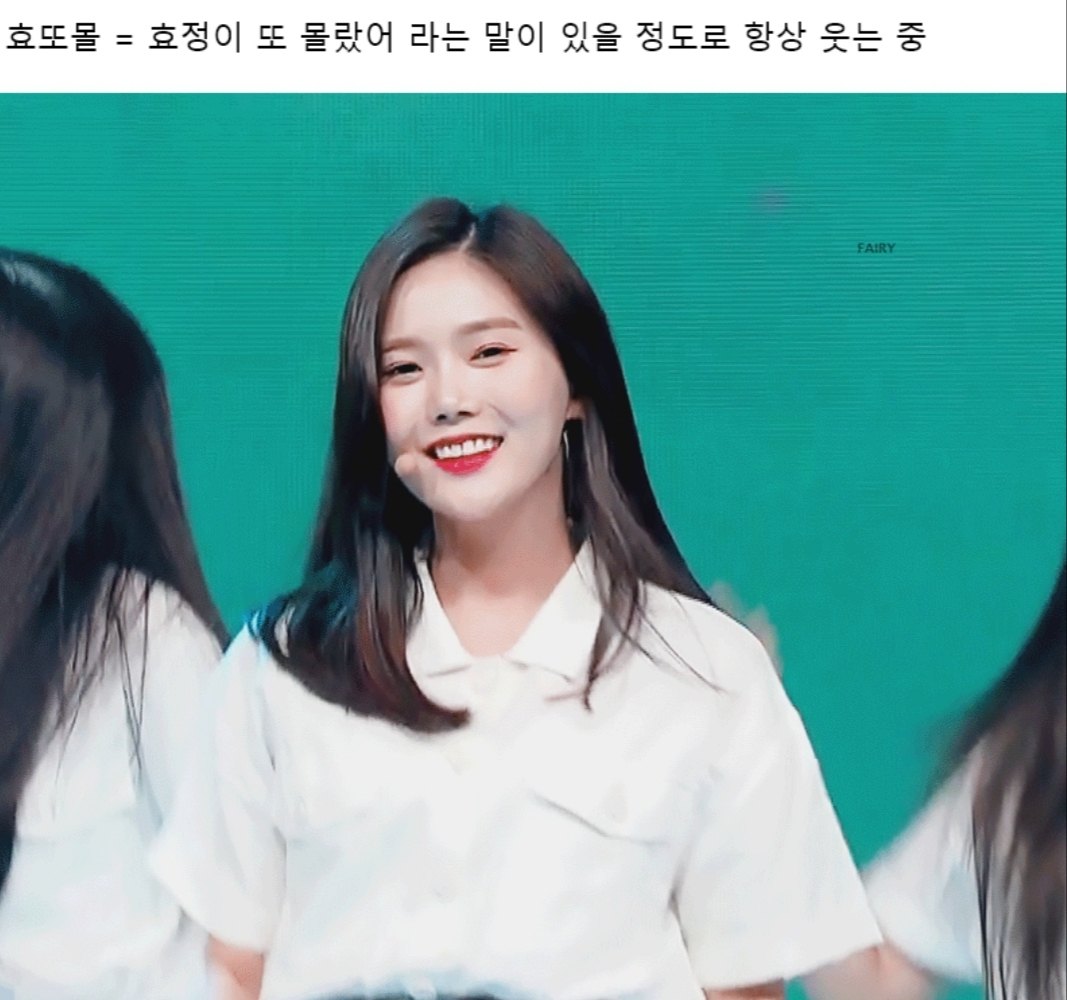오마이걸 멤버 효정은(위의 가운데) 어떠한 상황이나 컨셉에 상관없이 웃는 표정으로 유명함