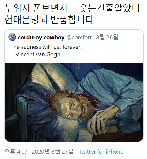 금동보화Sns에 올라온 엉성한 그림을 보며 웃는 고흐ㅋㅋ아 ㅋㅋ그거 그렇게 그리는 거 아닌데 ㅋㅋㅋ
