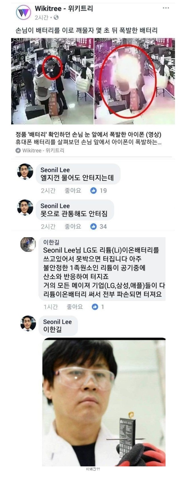 꿀리지말고당당하게오래전거지만 이한길 저거 화학 대충배운 티내네.... 리튬이온배터리가 리튬으로만 이뤄진것도 아니고 철보다 반응성 높아서 반응약한데 거기다 산소하고 반응한다는게 신박하네.... 이미 산화된 1족이 더 산화되는게 쉬운것도 아니고....