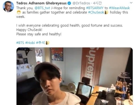 테워드로스 아드하놈 거브러여수스 WHO 사무총장은 자신의 트위터를 통해 "이번 주 가족들이 모여 추석 연휴를 축하하는 가운데 BTS 제이홉이 (팬클럽) 아미에 마스크 착용을 상기시켜줘서 고맙다"고 했다.